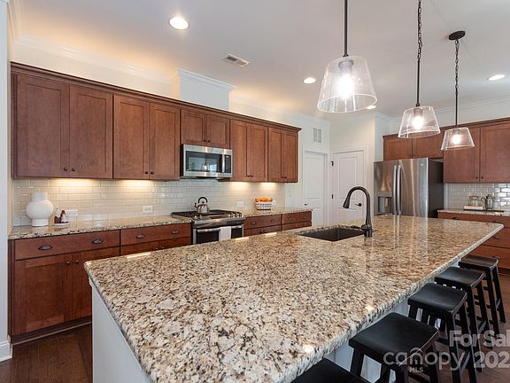 Lightly lived-in and beautifully upgraded, this home is in Trilogy Lake Norman, a premier gated 55-plus community. 5002 Looking Glass Trail sits on a premium lot backing to a wooded common area, offering privacy from your screened porch, paver patio with grilling station, and gas fire pit. Inside, you’ll find hardwood floors in the entertaining areas, fresh paint throughout, and a striking stacked-stone electric fireplace (TV above conveys). The kitchen features a gas range, vented microwave, under-cabinet lighting, soft-close cabinetry, and a spacious island with excellent prep space. A flex room, currently used as formal dining, complements a breakfast/lounge area.