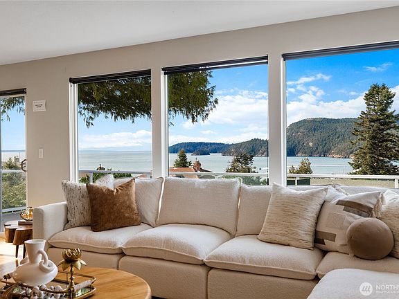 Experience a one-of-a-kind home in Skyline, offering over 200 degrees of serene views of the San Juans and Olympic Mountains. Designed to capture these stunning panoramas, the main living area offers an open layout connecting the kitchen, dining, and living spaces, with a spacious sitting area and expansive wall-to-wall windows. Effortless accessibility with an elevator linking the garage to the main living space. A versatile ADU or dream primary wing offers additional living space. The lower level features a generous flex room, perfect for a TV room, game room, exercise space. The exterior showcases low-maintenance landscaping complemented by an expansive deck. The oversized garage accommodates up to four vehicles, including large models.