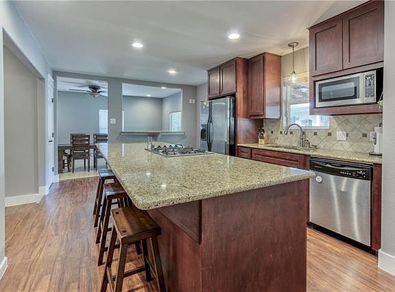 Updated 1328 sq.ft. one story 3 bd, 2 ba, ranch style home in South Austin, only minutes to downtown. Updated with granite counter tops, large center island with cooktop, stainless appliances. Kit. open to living area. Recessed lighting throughout. Air conditioner replaced 2015 with transferable warranty. Shaded yard with mature trees. Front and rear covered patios. Full landscaping in front yard. Carport, converted garage into flex space.