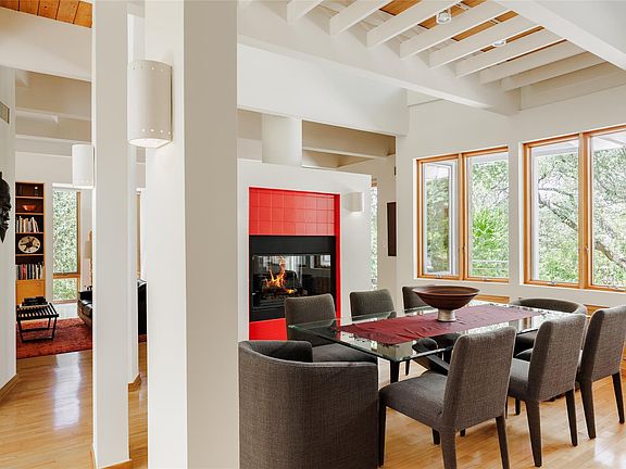 Discover a Central Austin home that balances luxury with environmental responsibility, designed for those who value a sustainable lifestyle. Unique architectural elements complement eco-friendly features, offering a living experience enriched by stunning surroundings and drought-tolerant, Firewise-designed landscaping by Ecotopes which not only conserves water, but enhances safety. Remodeled with quality materials and a clean, modern design by Julia Webber, the architectural highlights include beamed ceilings and open gathering spaces, along with striking wood windows and Ipe decks that connect seamlessly with the outdoors. The main level serves as a hub of activity, featuring a free-standing fireplace, floor-to-ceiling built-ins, and spacious living and dining areas that flow into a well-appointed chef's kitchen, breakfast room, den, and covered deck overlooking the private yard, pond, and pavilion. Every space is architecturally significant and offers views of nature. The upper level features four bedrooms, highlighted by a primary suite with serene treetop views, and a floating catwalk gallery that leads to the deck and its breathtaking vistas. The lower level hosts a 2-car garage, laundry room, and flexible bonus room, ideal for guest overflow, a gym, office, or hobby room, providing adaptability for the user. Every detail is crafted for convenience and environmentally conscious living, from the whole-house generator and 300-gallon rainwater collection system to the heat-reflective roof, ventilation system, and solar panels. A dual-port EV charger completes this home's thoughtful approach to sustainable, modern living. Conveniently situated near Balcones Drive, the location offers excellent walkability with easy access to nearby neighborhood favorites like Russell's Bakery & Coffee Bar and Yamas Greek Restaurant.