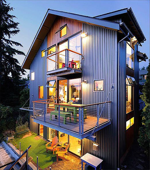 Charming Ballard bungalow with finished daylight basement behind a bold 3-story contemporary addition with large steel windows, balconies, exposed beams in LR, vaulted ceiling in master bedroom suite, and gas fireplace on each floor. Private front courtyard with pond and fountain, as well as side garden with smaller courtyard and garden shed.