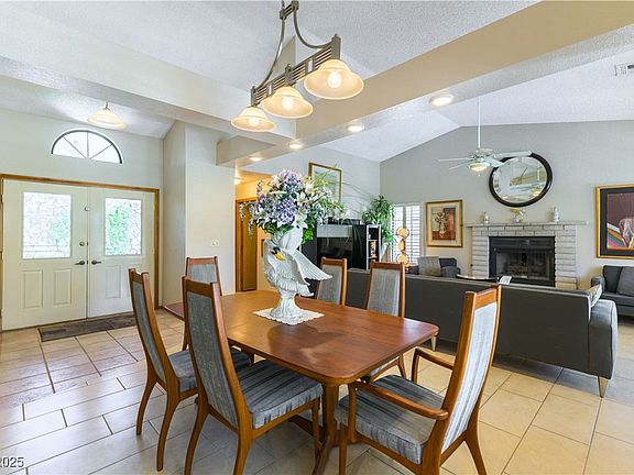 Las Vegas' best-kept secret! Located in a guard-gated community offering resort-style amenities including clubhouse, golf, pools, tennis, and pickleball. This light-filled 2-bedroom, 2-bath home features ceiling fans throughout, plantation shutters, and a cozy gas fireplace in the living/dining room. The eat-in kitchen is perfect for everyday dining. The spacious primary bedroom includes a versatile area ideal for a sitting room or office. The primary bath offers double sinks and a walk-in shower. Mirrored closet doors add a stylish touch. The 2-car garage includes a refrigerator. Recent upgrades: AC/heater (1 year old) and water heater (2 years old). A must-see!