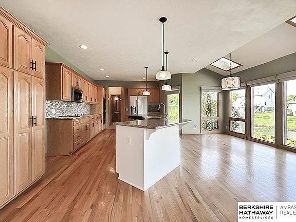PRE-INSPECTED! Stunning 2-story lakefront home in Papillion School District with 5 beds, 5 baths, & 3-car garage. Enjoy breathtaking lake views from all 3 levels! EXTERIOR PAINTED 9/2025! A cozy covered patio leads to a grand 2-story foyer & open floor plan with wood floors in the family room, foyer, & kitchen. Main level features living/office, dining, family room, kitchen w/ granite countertops w/glass tile backsplash, double oven, cooktop, a spacious laundry with drop zone, & large composite deck. Expansive primary suite offers sitting area w/ tile face fireplace, 2 walk-ins closets, lake views, & spa-like bath w/ granite dual vanity, free standing tub, tile & stone shower! Upstairs bedrooms are generously sized; 2 share a Jack & Jill bath, 1 has a private ¾ bath. Walkout basement includes rec room w/ wet bar, built-ins, 5th bedroom, ¾ bath, & access to covered patio w/ swing. The neighborhood has a walking trail, park, & tennis courts.