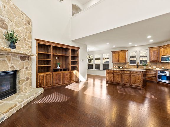 Floor-to-ceiling brick fireplaceLarge granite islandTall ceilingsLarge media roomLush greeneryRear-entry drivewayBeautifully manicured landscaping