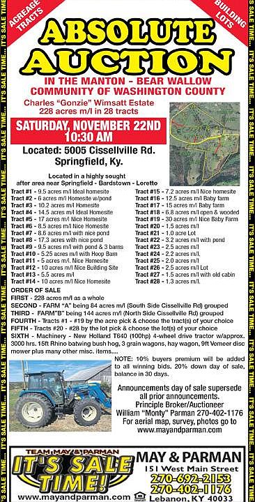 We are having an ABSOLUTE AUCTION for Charles Gonzie Wimsatt Estate on November 22, 2025, of 228 acres m/l in 28 tracts located at 5005 Cissellville Road Springfield, Ky in the Manton - Bear Wallow Community of Washington County. Farm is located in a highly sought after area near Springfield - Bardstown - Loretto. Tract #1 - 9.5 acres m/l with ideal homesite. Tract #2 - 6 acres m/l with nice homesite and a pond. Tract #3 - 10.2 acres m/l ideal homesite. Tract #4 - 14.5 acres m/l. Tract #5 - 17 acres m/l. Tract #6 & #7 nice tracts fronting Cissellville Road ranging from 8.5 to 8.6 acres m/l. Tract #8 - 17.3 acres m/l with nice pond. Tract #9 - 9.5 acres m/l with pond and 3 nice barns. Tract #10 - 5.25 acres m/l with hoop barn and pond. Tract #11 - 5 acres m/l nice homesite. Tract #12 - 10 acres m/l. Tract #13 - 5.5 acres m/l super nice homesite. Tract #14 - 10 acres m/l homesites!! Tract #15 - 7.2 acres m/l. Tract #16 - 12.5 acres m/l nice baby farm. Tract #17 - 15 acres m/l nice homesite or baby farm. Tract #18 - 6.8 acres m/l ideal open & wooded homesite. Tract #19 - 30 acres m/l super nice baby farm. Tract #20 thru Tract #28 is building lots ranging from 1 acre to 3.2 acres m/l. Tract #20 - 1.5 acres m/l. Tract #21 - 1.0 acres m/l. Tract #22 - 3.2 acres m/l with pond. Tract #23 - 2.5 acres m/l. Tract #24 - 2.2 acres m/l. Tract #25 - 2 acres m/l. Tract #26 - 2.5 acres m/l. Tract #27 - 1.5 acres m/l with old historical log cabin (poor condition). Tract #28 - 1.3 acres m/l. Farm will be SOLD as a whole, then 2 groupings, then tracts #1 thru #19 by the acre pick & choose, then lots #20 thru #28 by the lot pick & choose. Last will be machinery including New Holland T640 (100hp) 4-wheel drive tractor with approx. 3000 hours, 15ft Rhino batwing bush hog, 3 grain wagons, 9ft Vermeer disc mower plus many other misc. items.