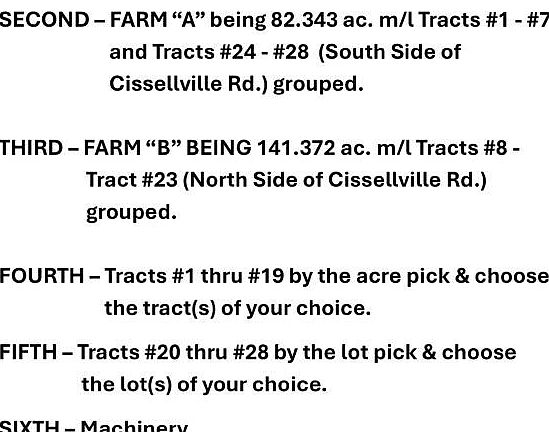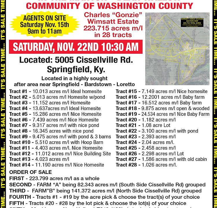 We are having an ABSOLUTE AUCTION for Charles Gonzie Wimsatt Estate on November 22, 2025, of 223.715 acres m/l in 28 tracts located at 5005 Cissellville Road Springfield, Ky in the Manton - Bear Wallow Community of Washington County. Farm is located in a highly sought after area near Springfield - Bardstown - Loretto. Tract #1 - 10.013 acres m/l with ideal homesite. Tract #2 - 5.013 acres m/l with nice homesite and a pond. Tract #3 - 11.152 acres m/l ideal homesite. Tract #4 - 13.637 acres m/l. Tract #5 - 15.268 acres m/l. Tract #6 & #7 nice tracts fronting Cissellville Road ranging from 7.439 to 9.317 acres m/l. Tract #8 - 16.345 acres m/l with nice pond. Tract #9 - 9.475 acres m/l with pond and 3 nice barns. Tract #10 - 5.510 acres m/l with hoop barn and pond. Tract #11 - 4.403 acres m/l nice homesite. Tract #12 - 11.012 acres m/l. Tract #13 - 4.023 acres m/l super nice homesite. Tract #14 - 11.190 acres m/l homesites!! Tract #15 - 7.149 acres m/l. Tract #16 - 12.201 acres m/l nice baby farm. Tract #17 - 16.512 acres m/l nice homesite or baby farm. Tract #18 - 9.875 acres m/l ideal open & wooded homesite. Tract #19 - 24.534 acres m/l super nice baby farm. Tract #20 thru Tract #28 is building lots ranging from 1.08 acre to 3.06 acres m/l. Tract #20 - 1.182 acres m/l. Tract #21 - 1.081 acres m/l. Tract #22 - 3.100 acres m/l with pond. Tract #23 - 2.393 acres m/l. Tract #24 - 2.043 acres m/l. Tract #25 - 2.458 acres m/l. Tract #26 - 2.298 acres m/l. Tract #27 - 1.586 acres m/l with old historical log cabin (poor condition). Tract #28 - 1.026 acres m/l. Farm will be SOLD as a whole, then 2 groupings, then tracts #1 thru #19 by the acre pick & choose, then lots #20 thru #28 by the lot pick & choose. Last will be machinery including New Holland T640 (100hp) 4-wheel drive tractor with approx. 3000 hours, 15ft Rhino batwing bush hog, 3 grain wagons, 9ft Vermeer disc mower plus many other misc. items.