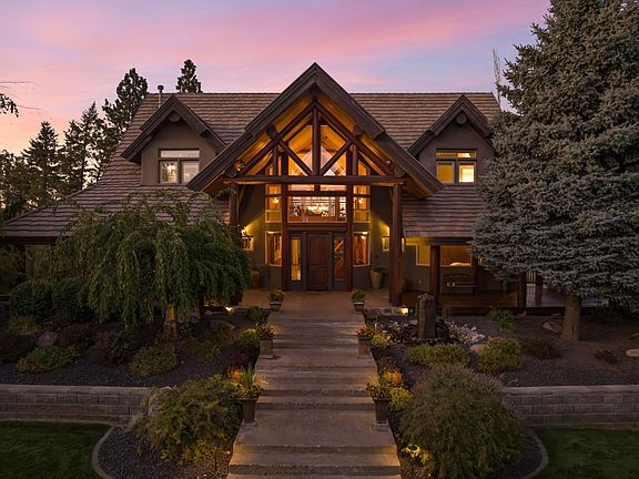 Perched majestically on Mt. Saint Michael, this Yellowstone-inspired luxury estate offers a breathtaking 180-degree view, with architectural and log elements that evoke the spirit of Montana ranches. Featuring grand 35-foot vaulted ceilings and expansive floor-to-ceiling windows, the residence spans 6,685 square feet and includes 5 bedrooms and 5 bathrooms. The master retreat boasts a spacious loft, a walk-in closet, and a fully remodeled ensuite. Complementing the main house are several additional structures: a 28x40 workshop, a 58x40 barn, and a horse setup. Expansive decks provide thousands of square feet for leisurely enjoyment and stunning views, while a fully equipped Accessory Dwelling Unit (ADU) offers 2 bedrooms and a 3-car garage. The estate also features a full-sized fenced regulation tennis court and an exquisite pool, combining luxury with practicality, making it perfect for relaxation and entertaining. Experience rural tranquility with convenient access to Spokane’s vibrant cultural scene.