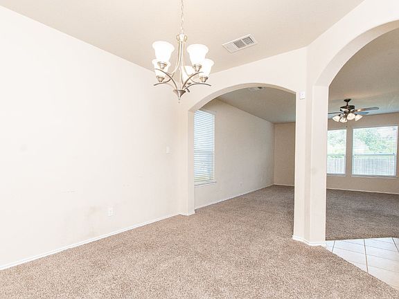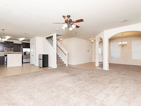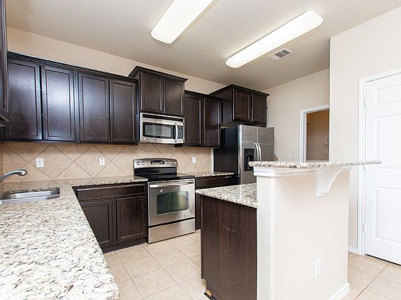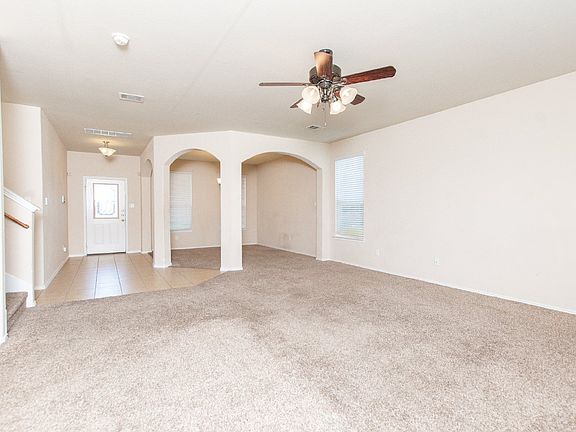 This charming two-story home features ceiling fans throughout and an open floor plan leading to a kitchen with granite countertops, an island, a breakfast bar, custom cabinets, stainless steel appliances, and a pantry. The home includes a laundry room with washer/dryer hookups, and decently sized rooms. The primary bedroom boasts a ceiling fan, a separate shower, a garden tub, a double vanity, and a walk-in closet. The spacious backyard is privately fenced, perfect for outdoor activities.