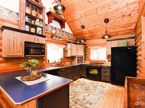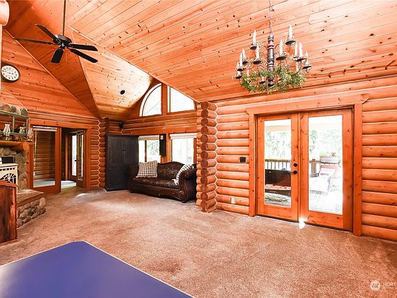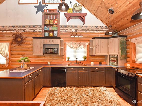 Property is contingent - seller is open to offers. Beautifully crafted custom log home w/ nearly 60ft of lake front on Panther Lake w/ abundant charm! This 2 bedroom home w/ extra spaces has been well maintained & cared for. Upon entering you are greeted by an open kitchen w/ vaulted sprawling ceilings. Adjacent, the dining area opens to a partially covered deck stretching the width of the home w/ stunning views of the lake. Main floor also features large bdrm w/ french doors to deck, staircase that leads to upper loft area, great for additional office. Downstairs is primary bdrm & bath w/ sauna, walk in closet, area for pellet stove. Room & laundry. Great level backyard, large lot w/ circular drive, newer dock + 50 year comp roof.
