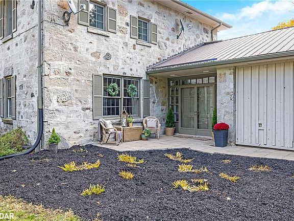 This circa 1875 fieldstone farmhouse has been thoughtfully redesigned by architect Grant A. Whatmough and is set on approximately 99 acres behind a gated entry. Maintaining classic charm and embracing modern conveniences, this property is ready for a new family to carry on tradition. The main floor welcomes you with a double-door entry leading into a spacious open-concept kitchen and large living area, highlighted by a stone fireplace and deep windowsills. The kitchen features Corian counters, stainless steel appliances, a center island, and walkout access to a covered stone patio and in-ground pool. Enjoy cozy breakfasts by the wood-burning fireplace or host larger gatherings in the formal dining room. A rare main-floor primary suite offers hardwood floors and a walkout through double French doors to a sunroom with heated floors overlooking the perennial-filled backyard and pool. The spa-style ensuite includes heated tile floors, a double glass shower, and a soaker tub. Upstairs, you will find four bright and spacious bedrooms, each with closets and windows overlooking the private property. In addition to the extra height on the second floor, the family retreat features two updated baths, upper-level laundry and generous closet space. Outdoor living here is highlighted by a 20' x 40' geothermal heated marbelite pool with diving board, flagstone patio, and a covered entertainment area for summer events by the pool. This space comes complete with a pizza oven and covered cooking area. A heritage post-and-beam barn (circa 1860) with hayloft, a secondary garage or shed & a silo enhance the property's charm. Mechanically, the home offers dual geothermal systems (for house & pool), radiant in-floor heating, two drilled wells, and an active lease on approximately 52 workable acres. Trails & a 21-acre woodlot provide endless opportunities for exploration. This one-of-a-kind rural retreat is just minutes from town amenities-ready for its next family to move in and enjoy.