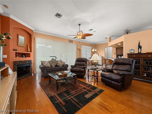 Welcome to the Country Club of Sebring! This beautiful 3-bedroom, 2-bathroom home with 2 car garage and side entry golf cart garage is perfectly situated on the 18th hole of one of Sebring's premier golf course communities. Enjoy peaceful fairway views right from your very own screened in lanai and experience the relaxed Florida Lifestyle this desirable neighborhood offers. Step inside to find a bright and open floor plan designed for comfort and entertaining. The spacious living area features abundant natural light and connects seamlessly to the dining and kitchen spaces. There is an office, library, or Billard room off the front entry foyer. The split-bedroom layout provides privacy, with generous primary suite offering a walk in closet and private ensuite bath. Home features hardwood floors, corner fireplace in living room, granite counter tops in kitchen and maple cabinets. Whether you are seeking full-time residence, winter retreat, or investment property, this home offers the perfect blend of comfort, lifestyle and location.