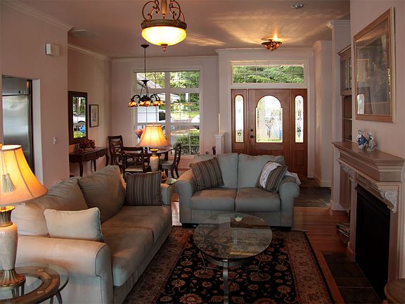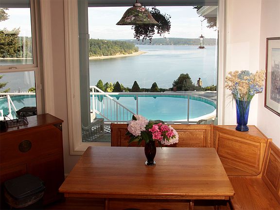 Custom high-bank waterfront home, 3 bdrm, 2 bath, 2 fireplaces. Hardwood floors, crown moulding, 10-ft ceilings. Stainless steel appliances. New heating/cooling system. Large walk-in closet, jetted tub, and dual shower in en suite. Water views from most rooms. Large swimming pool w/heat pump.. Near 180-degree view of mountains, islands, and salt water. Spacious covered front porch and 3-tiered deck around pool. Attached garage, RV parking. Quiet private tree-lined road. Abundant natural beauty.