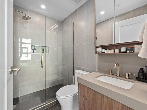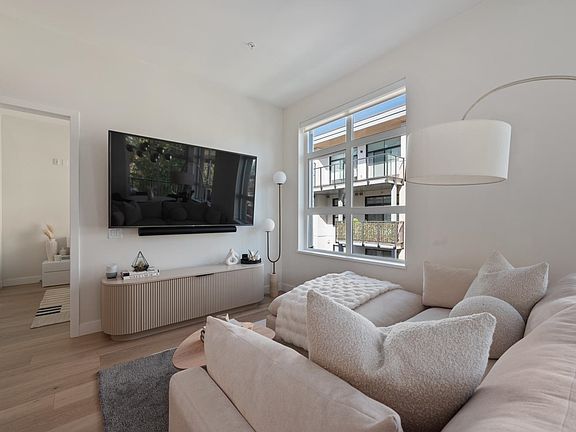 Welcome to Autograph, this bright and spacious two-bedroom, two-bathroom home offers 1000 square feet of thoughtfully designed living space in one of Vancouver's most desirable neighbourhoods. The open-concept living and dining area is filled with natural light, complemented by a modern kitchen featuring premium Bosch appliances, quartz countertops, and sleek cabinetry. The primary bedroom includes a private ensuite bath and ample closet space, while the second bedroom is generously sized for versatility. Both bathrooms are appointed with contemporary fixtures, and the home also provides in-suite laundry for added convenience. A private balcony extends the living area outdoors, perfect for morning coffee or evening relaxation.