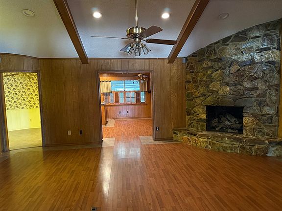 Custom stone fireplaceMature oak treesNew cedar fenceFreshly painted exteriorHardwood floorsSeveral ceiling fansLarge circular breakfast nook