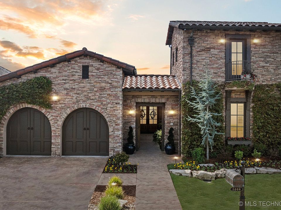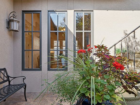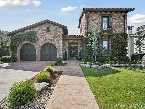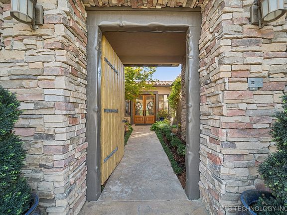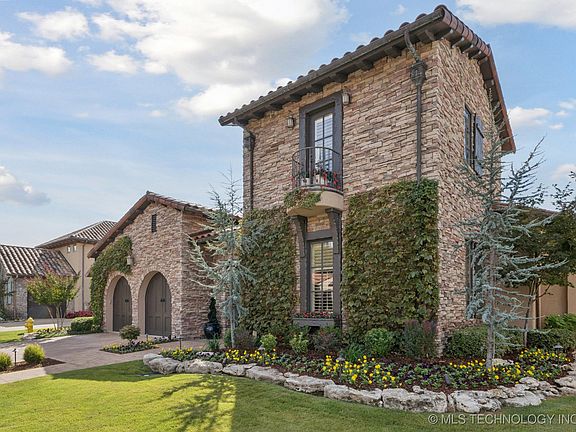 Built by Hollinger & Associates, this beautiful Tuscan style villa has been featured in Distinctly Oklahoma magazine. Boasting two courtyards, the artisan finishes and craftmanship offer the perfect blend of sophistication, comfort, and resort-style living. The architectural details of the home are art unto themselves. The travertine floors throughout are topped by a tile base. Soaring 10' ceilings are complimented with ornate Acanthus trim molding. Upscale finishes are carried throughout the open-concept layout designed for both relaxed daily living and seamless entertaining. The grand kitchen features a granite island with seating, double ovens, large gas cooktop, walk-in pantry, and a dining area with abundant natural light. The main courtyard is enclosed with three walls of plate glass windows, with access into the home on all three sides. The fourth wall features a large, rustic, natural stone fireplace. This space also includes a raised dry-stacked natural stone fountain. The spacious primary suite flows into a luxurious spa-like bath with separate vanities, and a large, well-designed closet. A second bedroom, with two walk-in closets, currently has custom bunk beds but can easily be transformed back to the original layout. Located inside the smaller courtyard, a staircase leads to a one-bedroom/one-bath guest suite with a cantilevered Juliet balcony. This suite is totally separate from the rest of the living space. Features you will love: private home office, clay tile roof with 2 x 10 framing, copper guttering, plantation shutters, hot water circulation pump, central vacuum, aluminum clad casement windows, 8' interior doors, professional landscaping, smart sprinkler system, and a fully fenced yard. This stunning oasis is perfectly situation in the prestigious gated community of the Villas of Tuscany and zoned to the award-winning Bixby Schools district.