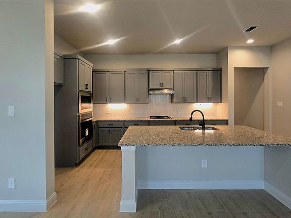 Open floorplanGranite countersLandscaped interior lotSleek eat-in kitchenDecorative lightingKitchen islandSprinkler system