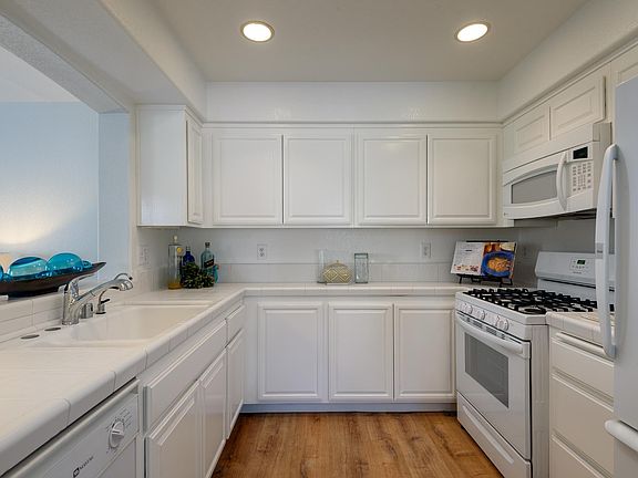 The search is over! Rarely available contemporary townhome-style condominium, located in beautiful Sungate Ranch, surrounded by farms and access to shopping and open spaces. Clean and crisp updates throughout include complete interior painting, new lighting, modern vinyl plank flooring. The living room with gas fireplace and cathedral ceilings is open and airy, with access to a private fenced patio. Pass through from the kitchen through the dining bar connects for desirable social connection. This is a south facing end unit with lots of natural light. 2nd story bedrooms have verdant views, and 1 full bathroom. 1/2 bath downstairs and a 1 car garage with washer/dryer. Sweet community pool. Pets welcome! HOA dues are $447/month. Trustee to review all offers at 7 pm 9/13.