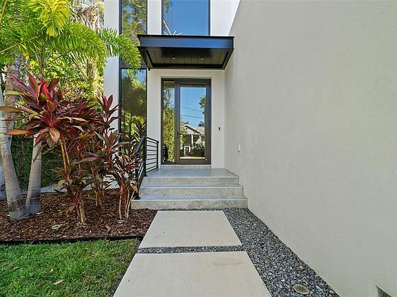Tucked away in a private enclave, this property ensures your privacy without sacrificing convenience or luxury. Just steps from stunning bayshore views, this meticulously crafted 2,815 sq. ft. home seamlessly blends modern sophistication with everyday comfort. Constructed like a fortress with masonry exterior walls on both the first and second floors, this home sustained no damage or water intrusion during last year’s hurricanes. As you enter through a grand 20' ceiling foyer, expansive commercial ‘impact-rated’ doors and windows flood the open-concept interior with natural light, showcasing sleek, high-end finishes. The kitchen, a standout feature, spans the length of the home, featuring a 10 ft quartz waterfall island perfect for entertaining, a seamless bar flowing into the dining area, and views of the entire floor, including the expansive outdoor balcony that stretches across the back of the home. Adjacent to the balcony, an outdoor kitchen elevates the space, complete with a built-in grill, sleek countertops, a stainless steel sink, and ample storage, perfect for hosting gatherings. The living room radiates sophistication with a three-sided electric fireplace, creating a warm ambiance for cozy evenings. Imported Italian 48 x 48 tiles flow throughout the first floor, enhancing the seamless indoor-outdoor living experience. An additional feature showcases a 135-bottle wine rack display encased in floor-to-ceiling glass, accented by satin-finish handlebars. Additional conveniences include a walk-in pantry, powder bath and a discreet hidden closet for private storage. The first floor also features a spacious two-car garage with an epoxy-coated floor, complemented by stairs with the same imported Italian tiles as the home’s interior, ensuring a cohesive and luxurious aesthetic. Upstairs, lush tropical landscaping with towering palms and meticulously manicured grounds captivates the senses. This three-bedroom home offers intimate spaces for relaxation, with the primary suite serving as a tranquil retreat. Its windows frame mature trees, creating a serene, treehouse-like ambiance as you feel suspended among them. The suite flows effortlessly into a spa-inspired bathroom, connected to his-and-hers closets and a conveniently accessible laundry room. Thoughtfully crafted for style and functionality, this home is a luxurious haven you’ll never want to leave.