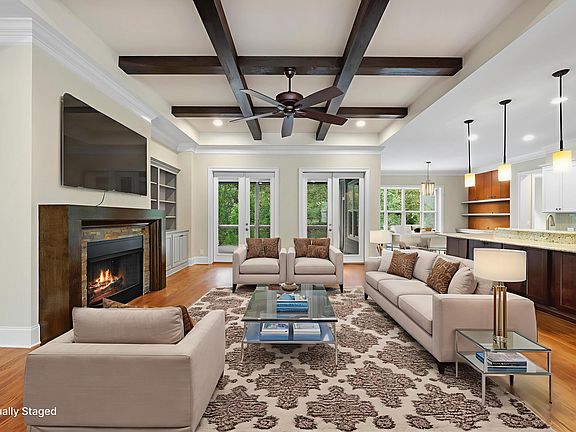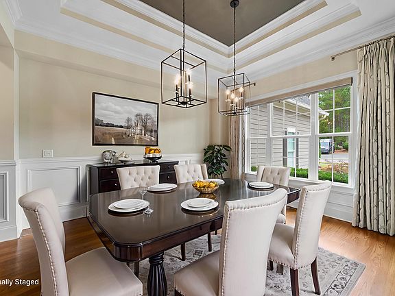 Experience luxury living perfectly balanced with convenience and tranquility. This exquisite 4-bedroom, 4-bath home—crafted by the highly sought-after Arthur Rutenberg (AR Homes), known for exceptional quality and craftsmanship—offers refined living in the prestigious Dunhill community. Ideally situated convenient to RTP, Durham, Raleigh, Chapel Hill, and RDU Airport, this home provides easy access to major destinations while being tucked away from busy roads, creating a peaceful, small-community feel that's rare to find. Inside, elegance meets functionality with an open floor plan, rich hardwood flooring, and a gas fireplace that adds warmth and sophistication to the family room. The gourmet kitchen impresses with stainless steel appliances, a large center island, granite countertops, and abundant cabinetry—perfect for both everyday living and entertaining. The FIRST FLOOR owner's suite offers a private retreat with a spa-inspired bath, featuring custom tilework, a soaking tub, dual vanity, and an oversized walk-in closet. Two additional first-floor bedrooms provide flexible options for family or guests. Upstairs, a bonus room with built-in bookshelves, a full bath, and a walk-in closet offers the versatility of a fourth bedroom, guest suite, home office, or media room. Enjoy outdoor living at its finest on the screened porch overlooking the beautifully manicured backyard. The stone patio beneath the porch and side patio with stone accents create inviting spaces for relaxation or gatherings. An oversized 22.9 x 30.7 (696 sq ft) garage provides ample storage and convenience. Located near the American Tobacco Trail, Southpoint Mall, and UNC Health Center, this home delivers the perfect blend of luxury, location, and lifestyle.