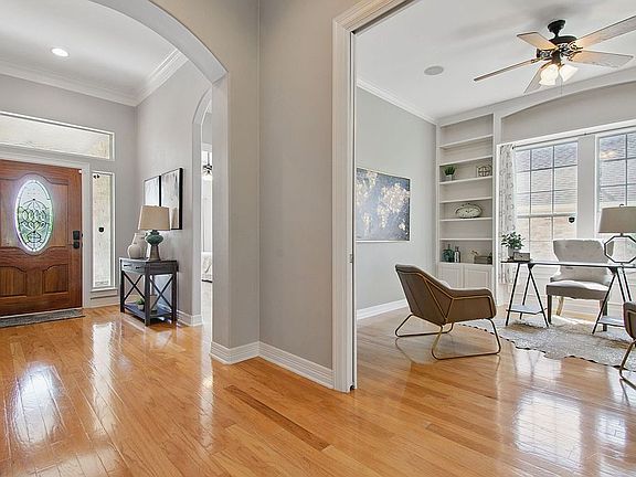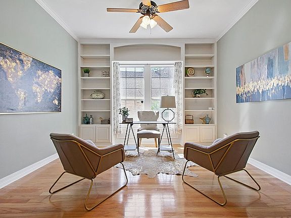 The living room boasts high ceilings, built-in cabinetry, and a gas fireplace for those odd chilly Texas days. The principal bedroom has a walkout to the patio and room for a sitting area. The ensuite bathroom is bright and spacious, featuring a jetted tub and a multi-jet shower to soothe any aching muscles. The adjacent dressing room offers ample storage with hanging spaces, shelves, and drawers.