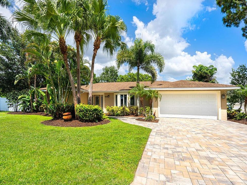 This beautifully landscaped and updated pool home located on a nearly half acre lot has many upgrades and is a MUST SEE! Your arrival is welcomed with a paver driveway and sidewalk that leads past gorgeous landscaping as you approach the inviting glass entry door with sidelights. Upon stepping into the foyer, your attention will be drawn to the spacious great room, the adjacent dining area and the updated kitchen, each finished with crown molding, arched accents and beautiful travertine floors. The gourmet kitchen features solid wood cabinetry with custom trim, granite counters, tile backsplash, under cabinet lighting, stainless appliances and a breakfast bar. The private master suite will impress with direct access to the lanai, a generous walk-in closet, an attractive granite topped vanity and a large walk-in shower. Additional features include a surround sound system, an abundance of recessed lighting, impact glass sliders and hurricane shutters. The light and bright floor plan opens to an oversized screened lanai overlooking a lagoon styled pool surrounded by a travertine deck creating a wonderfully blended indoor/outdoor living area ideal for entertaining or just hanging out with friends and family. The large fenced yard provides a great place to play while maintaining your privacy or a place to store your boat and RV. This very appealing property is situated within a Non-Deed Restricted section of Palm Aire. There are NO HOA FEES, NO CDD FEES and NO REQUIRED MEMBERSHIPS! This home is ideally located close to a public park, dining, shopping, the culture of downtown Sarasota and the beautiful beaches of Siesta Key. It is a short drive to world class shopping and dining at the popular University Town Center Mall. Take advantage of this opportunity to start living the wonderful Florida lifestyle that awaits you.