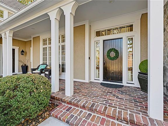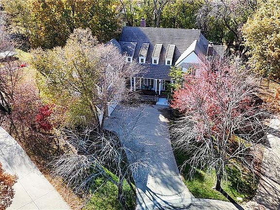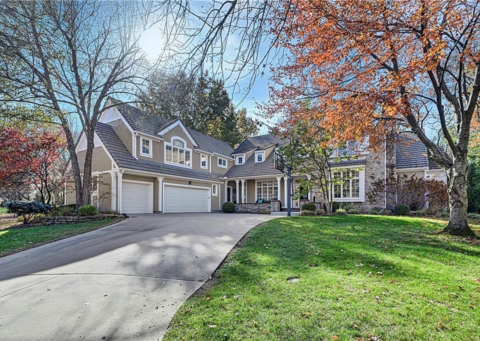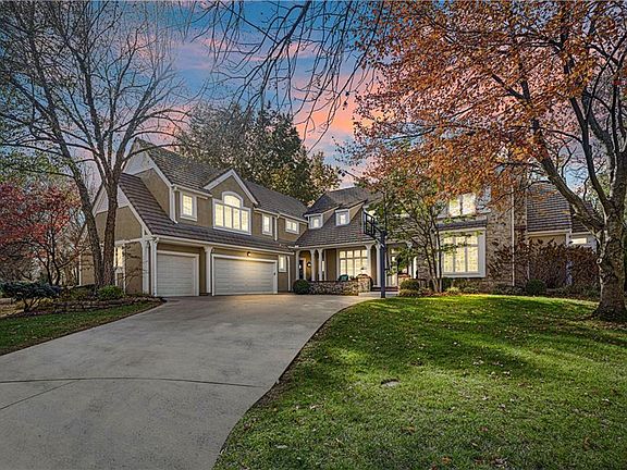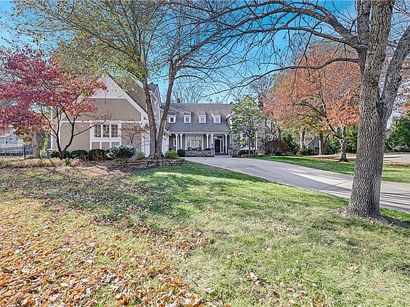 From the moment you arrive, this home impresses with its classic curb appeal featuring white columns framing the expansive brick lined front porch, and an extended driveway with side entry garage. Majestic trees frame the property which sits on a half-acre fenced homesite at the end of a quiet cul-de-sac. Step inside to a home designed for both grand entertaining and everyday family life, full of character, charm, and custom details.The great room immediately captures your attention with soaring 20’ windows framed by elegant columns and a cozy fireplace, creating a bright and inviting space to gather. Hardwood floors flow throughout the main living areas, leading to a curved stairway that adds timeless charm. The classic wood-paneled office on the main level is perfect for focused work or study, while the vaulted hearth room, with its majestic wood beams and stacked stone fireplace, offers a welcoming space for family evenings. The kitchen is a chef’s dream, featuring a spacious island, farm sink, double ovens, and a large pantry—ideal for cooking together and entertaining.The home home offers six generously sized bedrooms, each with its own private bath, including two owner’s suites. The main level suite features an updated bathroom with dual vanities and two closets, while the second, upstairs suite boasts a large bedroom and fabulous renovated bath. A fun upstairs bedroom with its own loft, plus a separate large loft area for TV, games, or studying, make this home perfect for families of all ages. The finished lower level invites relaxation and play with a bar, family room with fireplace, and an additional bedroom with full bath. Step outside to a huge wrap-around brick-lined patio, perfect for dining al fresco, cozy nights by the fire pit, or soaking in a hot tub. Ideally situated in south Leawood, within the Blue Valley School District, every detail of this home makes it a place where family memories are made and friends are always welcome.