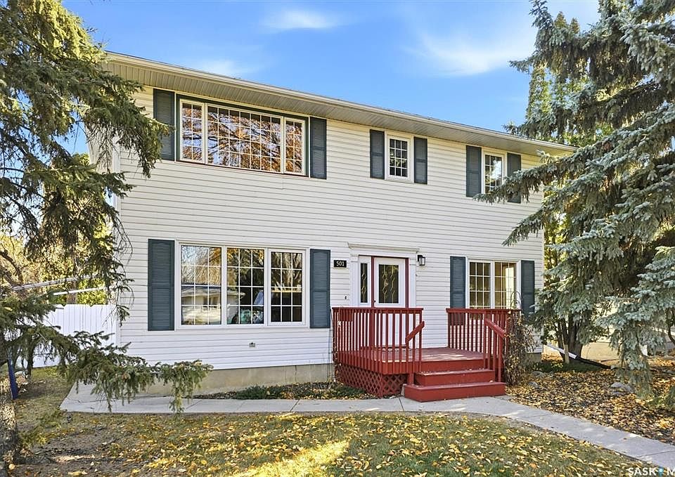 **Open house - Saturday Nov 22 from 1:30-3pm** Welcome to 501 Bate Crescent, ideally located on a quiet street in the highly sought-after neighbourhood of Grosvenor Park. This spacious two-storey home offers 1,976 sq. ft. of living space above grade with 5 bedrooms and 2 bathrooms, providing an excellent layout for growing families or those seeking extra room to spread out. The main floor features a bright living room with original hardwood floors and a charming wood-burning fireplace, creating a warm and inviting atmosphere. The formal dining room flows nicely into the well-sized kitchen, offering ample workspace and storage. Also on the main level is a convenient laundry/bathroom combination and a welcoming front foyer. Upstairs you’ll find four bedrooms, including a generous primary bedroom, along with a full 4-piece bathroom. Please note that the fourth upstairs bedroom does not include a closet, making it ideal for a nursery, office, or flex space. The fully finished basement adds even more versatility with a family room, den, additional bedroom, and a workshop area — perfect for hobbies, storage, or future customization. Outside, enjoy a very private and mature yard with trees, shrubs, deck, and fenced space, ideal for entertaining or relaxing. The outdoor swimming pool features a new liner and has been professionally maintained by Paradise Pools, offering peace of mind and summer enjoyment. A detached single garage completes the exterior. Notable updates include a newer furnace and hot water tank, updated electrical, original hardwood flooring, and the character of a classic 1960-built home with solid construction. This is a fantastic opportunity to own a well-maintained property on a large 50’ x 140’ lot in one of Saskatoon’s most established and desirable neighbourhoods, close to the University of Saskatchewan, parks, schools, and amenities.