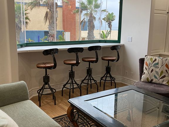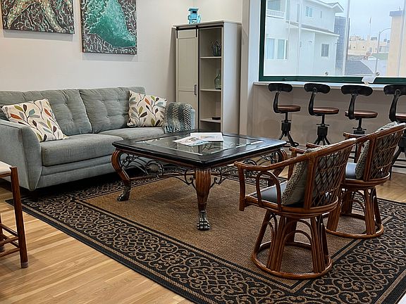 This recently remodeled, fully-furnished and air conditioned 2 bedroom, one and one-half bath unit is two levels with hardwood floors, quartz counter-tops and ocean views from the living room and both bedrooms. There is a kitchen with a breakfast bar (seating for three - no separate dining area), living room and powder room on the first level. The L/R has a bay window with a counter and four chairs so you can eat a meal, drink your coffee or work on your computer while enjoying a panoramic view of the beach and ocean. We call it the "sand bar." There is also a 54' ROKU TV with surround sound so that you can sign in to your streaming services. There is no live TV. The second level contains two bedrooms, a bathroom with a shower and a private washer/dryer. Bedroom 1 has a queen size murphy bed that easily converts to a desk if you need another place to work. The second bedroom has two twin beds with pillow-top mattresses that can be combined to make a king size bed. There are no TVs in the bedrooms. From the second level you go up to an amazing rooftop deck with a teak table and four chairs as well as two teak steamer chairs (the deck is shared - but just with us and we seldom use it). There is free WIFI as well as a CAT5 internet hookup. There is designated off-street parking for one car. All utilities are included. We have a very strict no party policy. There is no smoking of any kind anywhere on the property. A small pet may be considered with an additional security deposit and cleaning fee. Minimum 30 day rental available beginning 10/5/24. The unit is NOT available February 2025. Owner pays all utilities. Minimum one month. Unit is NOT available February 2025