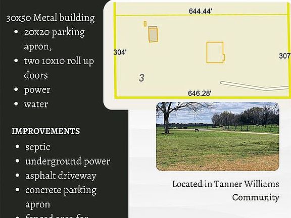 4.69 Acres in Tanner Williams Community. 30x50 Metal Building with 20x20 Parking Apron and two 10x10 rollup doors power water - Homeplace with Septic, underground power, asphalt Driveway, Concrete Parking Apron and fenced area for Livestock and Poultry. Pecan and Fruit Trees. Home Site Ready