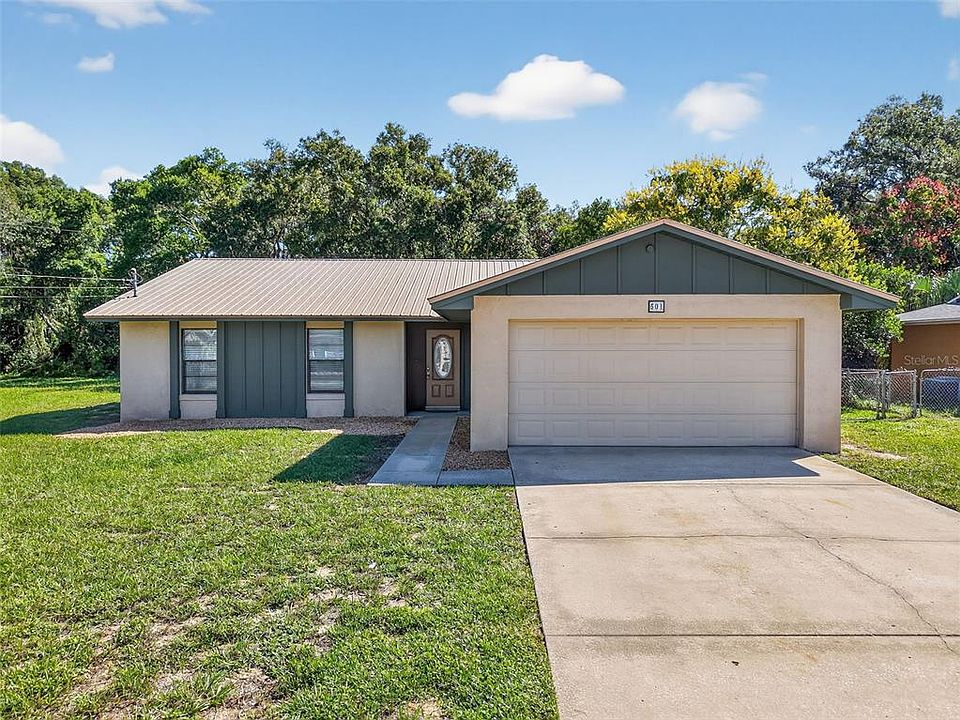 AFFORDABLE AND IMPRESSIVE MOVE-IN READY 3/2 EUSTIS HOME WITH FENCED YARD AND NO HOA. Welcome home to this centrally located community, offering quick access (approximately 1.5 miles) to the local waterfront area. This area features excellent restaurants, a public boat launch, and beautiful parks, all on gorgeous Lake Eustis with access to the Harris Chain of Lakes. It’s also a quick drive to every amenity for shopping, dining, medical, and big box retail. This lovely 1,335 SF home has been consistently maintained and updated. It’s truly move-in ready! A metal roof was installed in 2014, the A/C in 2019, the water heater in 2023, and vinyl flooring throughout 2025, with the faucets and bathroom plumbing completed in 2023. The exterior and interior were freshly painted in September 2025. Enjoy abundant parking with an expansive driveway and a 2-car garage, freshly painted, including the floor, with washer/dryer hook-ups and a utility sink. From the driveway, take the paved walkway to the covered front door and step inside to the warm and welcoming interior. It features abundant natural light, recessed lights, large windows, a pleasing neutral color palette, and attractive vinyl wood plank flooring throughout, with low-maintenance tile in the kitchen and bathrooms. Hosting family and friend gatherings and holiday celebrations will be a delight in the open, spacious living and dining areas, which feature double French doors to a sun patio in the fenced backyard. The kitchen is well-appointed with wood cabinetry, nice appliances, including a side-by-side refrigerator, and a large double-door pantry. There’s a spacious dining alcove for casual family meals, or you could use the space to expand the kitchen. The primary bedroom has multiple windows, a ceiling fan, a walk-in closet, and an en-suite bathroom with a large, tiled walk-in shower. Two guest bedrooms have ceiling fans, double door closets, and easy access to the full hallway bathroom with a tiled tub/shower. Enjoy outdoor living in the fenced backyard, an excellent space for kids and pets to run and play. What a wonderful place to call home!