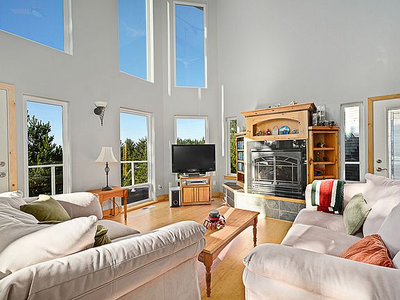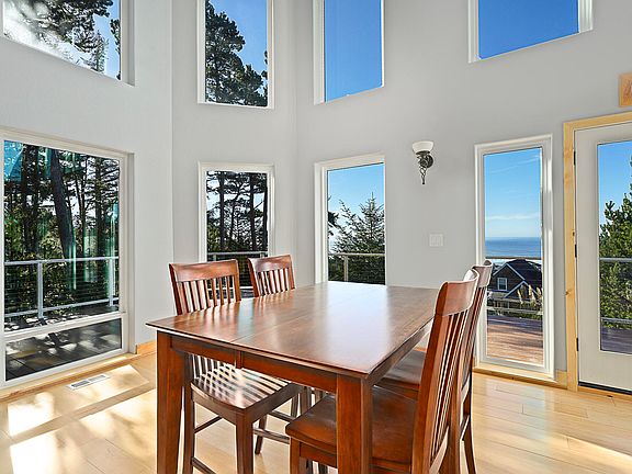 OCEANVIEW CUSTOM HOME, near beach trail. Just completed major siding/deck work...almost like buying a new house. Sweeping view from grand greatrm with 2-story vaulted ceiling. Bamboo floor, wall of windows, knotty pine doors/trim. Romantic oceanview master ste with see-thru fireplace open to large and luxurious ensuite bathroom. Spacious granite slab kitchen with island, open to greatrm. A bedroom on each floor. Endless hot water with tankless system. Across from beach trail. Gated community. Limited short term rental allowed