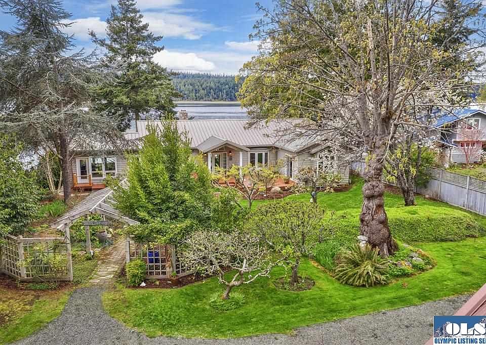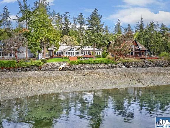 Enjoy tranquil island living w 100' of low bank waterfront, expansive water & mountain views & a high quality single level home. Large custom deck off living, dining & master. Quality features are found through out including dual side river rock glass fireplace, vaulted ceilings, gourmet kitchen w professional grade SS appliances, skylights, custom built in bookcase, bamboo flooring & more. The 2 car garage has a 1 bd studio attached.Garden space.Fire pit, outdoor shower, Tideland rights & more.