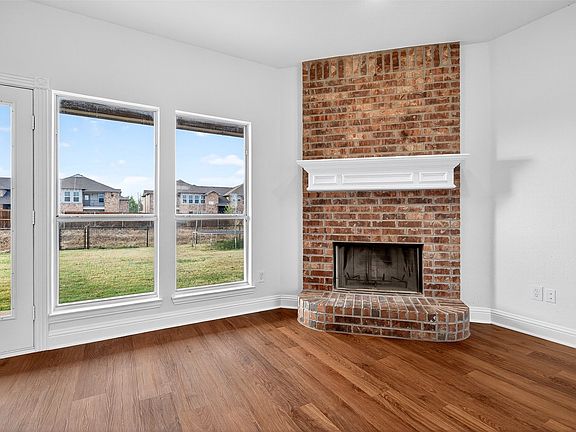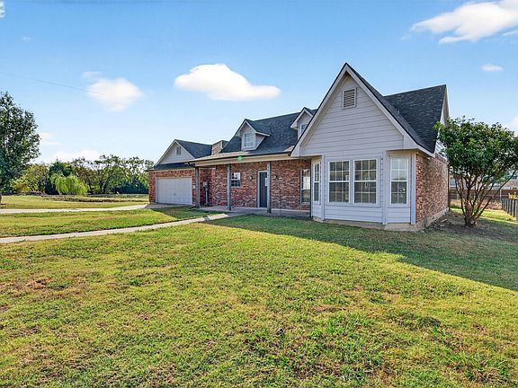 Brick wood-burning fireplaceAttached two-car garageSplit bedroom arrangementCorner lotDedicated dog runLarge fenced backyardAmple cabinetry