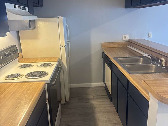 Kitchen equipped with dishwasher, stove, and refrigerator