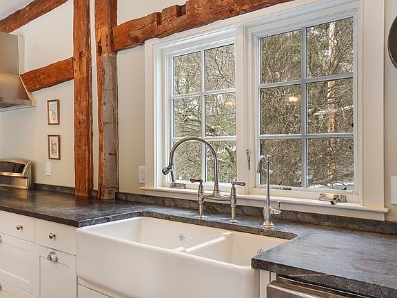 Gorgeous blend of new and old in this historic treasure known as the Litchfield Parsonage. The spacious eat-in kitchen is a chef's dream come true trimmed in hand-hewn beams with cathedral ceiling, soapstone counters, island seating for 6 and French door to the deck. Over 3,200 sq ft of warm and welcoming living spaces adorned with hardwood, exposed beams and colonial brick. Lovely woodstoves adorn the family and living rooms, and an oversized hearth graces the dining room. On the second floor, the master suite features a luxurious bathroom and walk-in closet. Fireplaces in all 3 bedrooms! The finished attic offers room for a sunny office and overflow guests. Situated on 3.29 acres among pastoral views, stone walls, a professionally planted orchard with apple, pear & peach trees, and established garden beds of perennials & asparagus. Freshly painted exterior, screen porch, detached 2-car garage, tractor shed and more. One look at this refined antique Colonial and you will be in love!