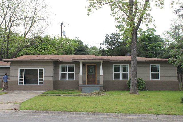 Located near Elm Creek Park this home has great hardwood floors in original house. The large kitchen features custom cabinets, tile styled vinyl flooring, stainless steel appliances and a bar area. An ample laundry rm is adjacent to the kitchen. The open dining room / living may be used as a great room. French door from the sunroom/office/breakfast area opens to the rock patio with terraced garden. The master bedroom has new carpet and a totally redone master bathroom with custom cabinets and large walk-in tiled shower and spacious closet. Enjoy the 2nd bathroom and 2 guest bedrooms split plan. A storage area or shop can be utilized in the extra space beside the single car attached garage. The back yard is fenced with semi-private fencing and sports a rock/stone patio and outside storage building. There is an un-covered site set up for a RV in the back side yard. The outside walls are a combination of brick veneer, wood shingles and hardiplank. The updates are being completed.