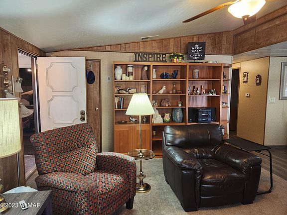 Are you looking for a lovely well-maintained, affordable home in the White Mountains? Consider this well-maintained 2-bed/2-bath, 1,668 sq ft. manufactured home with two exceptional well-thought-out additions and an oversized attached two-car garage, making this an extraordinary deal on the market. The main house features 1263 Sq ft., 2-bed/1-bath, vaulted ceiling, kitchen/dining area, full-size living room, dual pane windows, full-size utility room, plenty of storage, and central AC. The back addition, separate from the main house, encompasses 253 sq ft. guest quarters with a full bathroom, limited kitchen, and a gas fireplace with front access to a large patio and separate back entrances. The front 152 Sq Ft. addition makes an excellent Arizona/Den room with natural light for great reading while enjoying your morning coffee. This home is a corner lot in Fairway Park, offering paved street access, natural gas, sewer, city water, and a wooden fenced-in backyard for your pets. All contents, including but not limited to furniture, kitchenware, décor, some tools, and bicycles as seen at the property, will remain at the residence and convey at no value at the close of escrow. There is a voluntary HOA with a mandatory transfer fee only. The home is only 45 minutes from Sunrise Ski Resort and minutes from local lakes, hiking areas, and shopping. Move-in ready and waiting for you! Here is your opportunity to have a home in Show Low, AZ.