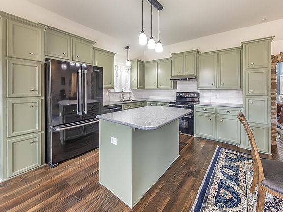 Stone fireplaceQuartz countersCovered patioNice islandCrown moldingChair railSprinkler system