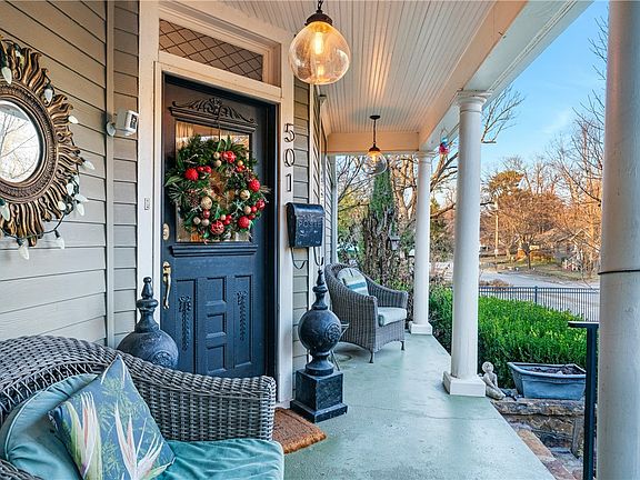 A standout residence in the Historic District, this updated three-story home combines character and modern amenities. The main level features a private office, elegant dining room, comfortable living area and a well-appointed kitchen with wood bar and mirror. Upstairs, the primary suite offers a serene retreat with a soaking tub, separate shower and expansive walk-in closet, accompanied by two additional bedrooms. On the third floor, a versatile bonus room offers a custom sectional with two full-size fold-out beds for guests or relaxation. High ceilings and a winding staircase reflect the home’s historic era, while mature evergreens, hollies and tulip poplars surround the property. Outdoor living is highlighted by a large covered back porch overlooking a private inground pool with a privacy fence surrounding the backyard and metal fence enclosing the front yard. Situated on a large corner lot with lush surroundings, this cherished home offers a thoughtful layout and easy access to Wilson Park & nearby bike trails.