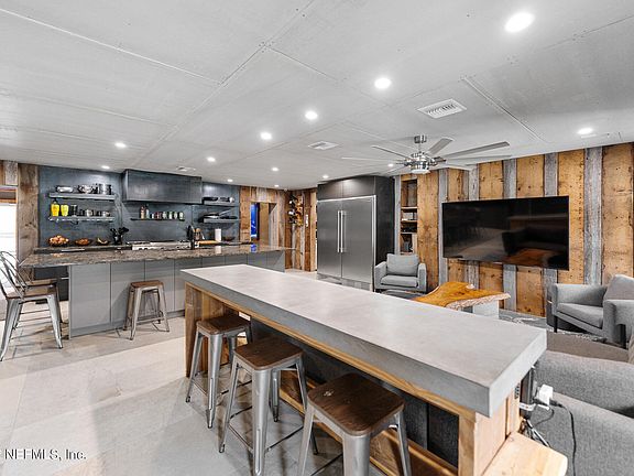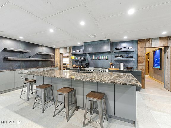 Come enjoy the beach lifestyle at this completely renovated ranch home. The industrial style details and updates make this home truly unique. Enter and your eye is drawn to the spectacular kitchen with luxury appliances, open shelving and a huge island. The Owner's Suite features exposed beams and an en suite bath with a soaking tub and separate shower that may be enclosed for the steam shower. The theatre room features stadium seating ,bar and a garage door style window that opens the space to the heated /chilled pool. Perfect for entertaining! An additional three bedrooms, office and two full baths complete the indoor living area. Outdoors the double gated backyard provides space for your boat/jet skis, and the detached single car garage has enhanced electric. Pls see supplement!