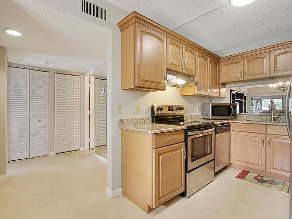 This recently updated 1st floor condo features wide northerly views of the golf course from the patio. Updates include kitchen, both bathrooms , flooring and electrical updates. Neutral wall colors and large neutral tile in the principle livings areas create a tasteful environment. Solid surface flooring in both bedrooms. No carpeting in this unit! Move right in and become a part of the Jupiter life style, Recently updated golf course is at your door step. The golf clubhouse is available for breakfast/lunch/dinner