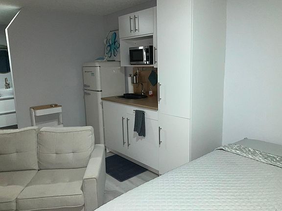 This is a newly remodeled studio apartment with an open concept. The shower is Italian marble and there is a double vanity sink. The apartment comes beautifully furnished and decorated. There is a kitchenette with microwave and fridge as well as coffee maker and some small appliances for cooking. This is a short term rental that allows for longer stays and is perfect for someone relocating to the area. Internet is provided and a smart tv. It is located 9 minutes from Indian rocks beach and one block from the Pinellas county trail.