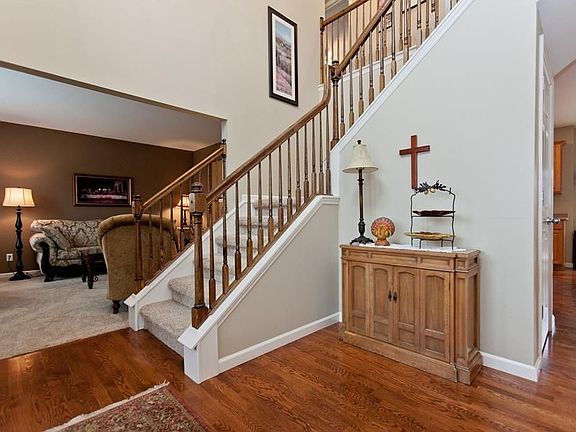 Wonderful setting on a cul-de-sac with large lot with woods and creek behind. A rare find in this well kept neighborhood. As you enter this 2 story you will love the high cathedral ceiling in the foyer and grand staircase leading to the second floor. Kitchen has a granite island with upgrade appliances. Your gas stove is a commercial Viking. 9 ft. ceiling and ample windows make this home light and warm with a great private view out back. Hardwood floors and carpet on main floor plus fireplace in living area with bookshelves on each side. Master bedroom is very large with master bath. Beautiful railing upstairs overlooking the open foyer. Lower level has daylight windows with a walk out. Great rec room and even a wine cellar. Three zones makes more more economically living. Maple cabinets. Must see to appreciate.