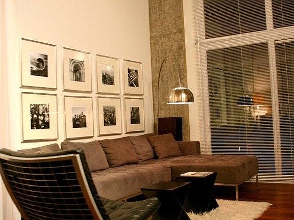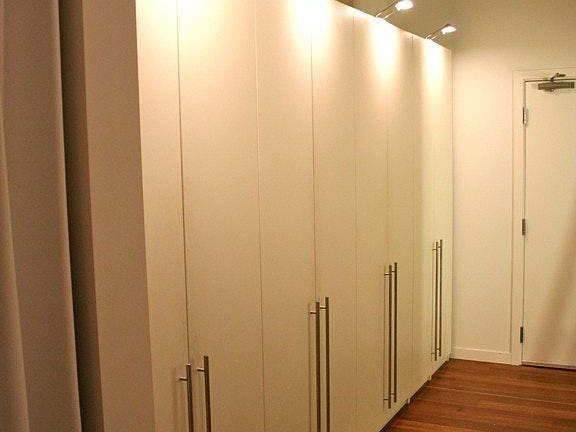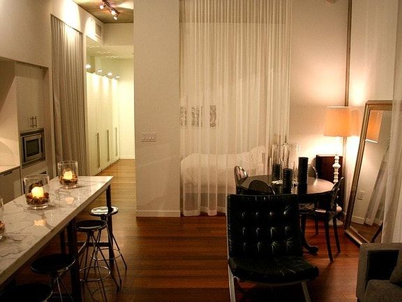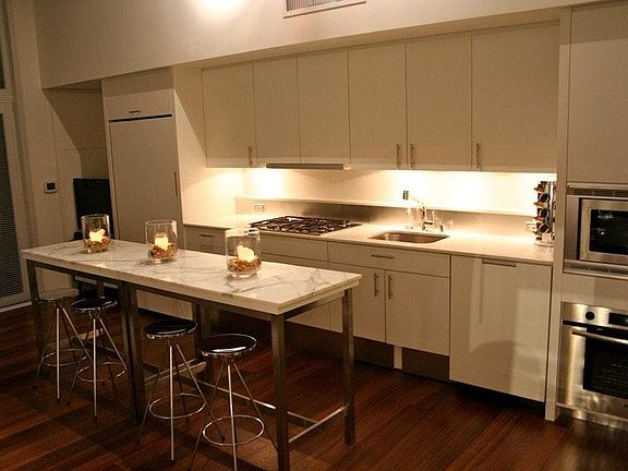 Sleek euro kitchenHigh ceilingsLots of lightSeparate bedroomGas cookingLarge storage cabinets