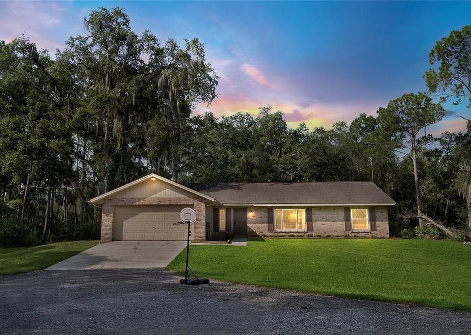 Welcome to the Neighborhood! Nestled on a picturesque 5 acre property, this home offers a serene escape from the everyday hustle, all while enjoying the conveniences of contemporary amenities. Step inside to be greeted by wood-look tile floors that perfectly complement the farmhouse aesthetic. The open living room, dining room, and kitchen seamlessly flow together, creating a spacious and inviting atmosphere. Immerse yourself in the rustic elegance of this farmhouse-style home, enhanced by whitewashed shiplap accents and a beautiful wood countertop in the kitchen. The slate tile backsplash adds a touch of character and complements the overall design. The kitchen is a chef's delight, featuring a convenient breakfast bar and an exquisite coffee bar with a beverage refrigerator—a perfect spot for your morning rituals. Steps away from the main living area you’ll discover your private haven-the primary bedroom. Experience the luxury of his and her walk-in closets, providing ample storage space for all your belongings. The ensuite bath is a retreat within itself, boasting a large shower and dual sinks, ensuring your daily routines are nothing short of indulgent. The other two bedrooms are thoughtfully situated on the opposite side of the house, offering privacy and convenience. They share a full bathroom complete with a tub and shower, making it ideal for accommodating family or guests. Embrace the Florida lifestyle in the screened-in porch and patio which extends the living space and provides an ideal setting for entertaining guests or simply savoring moments of relaxation. As the evening sets in, gather around the cozy fire pit and bask in the warmth of the crackling flames under a canopy of stars. Beyond the enchanting home, this property boasts impressive amenities, including a tranquil pond, two corals for horses or other animals, a barn, and a workshop complete with electric service. The entire property is fenced, and an electric gate adds both security and convenience. An old guard house near the front gate adds historic charm and houses the gate’s electrical connections. Your Dream Home Awaits. Don't miss the opportunity to make this rustic farmhouse retreat your own. Experience the harmonious blend of rustic charm and modern comfort that creates an ambiance of relaxation and contentment.