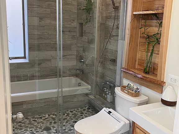 -Spa-like bathroom with custom wood work and walk-in wet-room.
