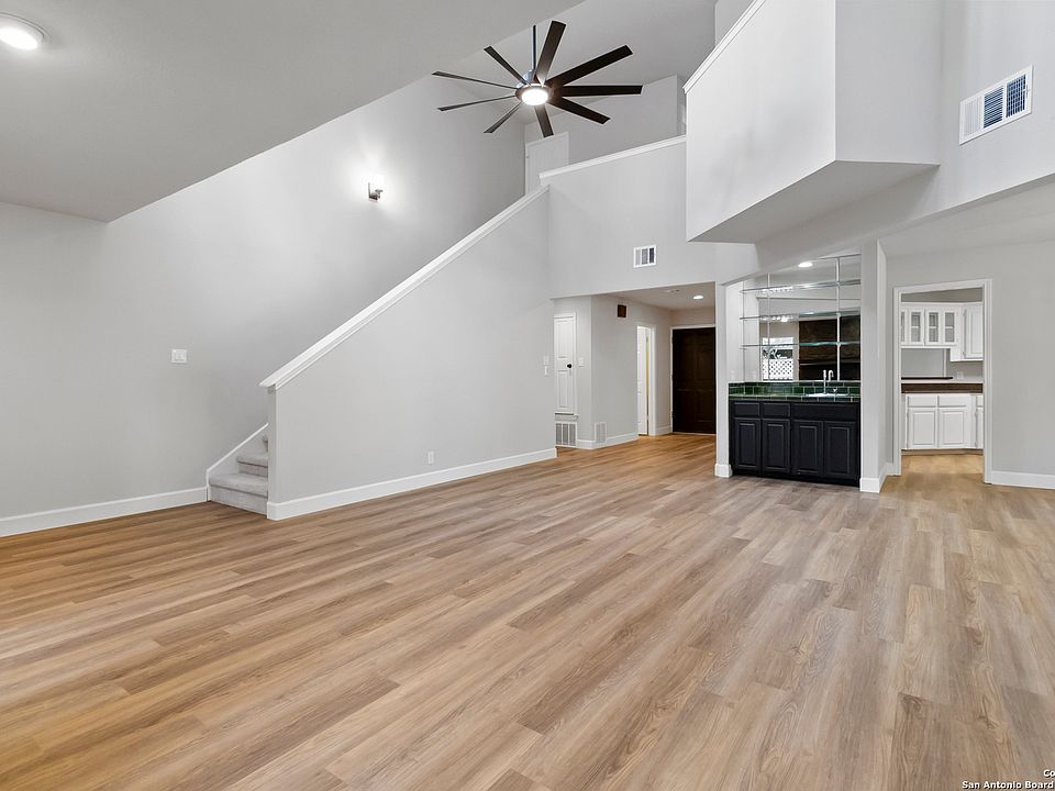 Welcome to 501 Thetford, a thoughtfully updated 3-bedroom, 2.5-bath villa nestled in a charming gated community in San Antonio. This spacious home blends modern finishes with functional living across two well-designed levels. Step inside to discover brand new vinyl plank flooring on the main level and plush Shaw carpeting upstairs, all set against a freshly repainted backdrop in designer-selected hues. The downstairs primary suite offers privacy and comfort with a walk-in closet, fully equipped ensuite bath, and direct access to a serene private patio. The flexible third bedroom includes a built-in desk, making it perfect for a home office or creative space. A cozy living room features a wood-burning fireplace and wet bar-ideal for both relaxation and entertaining-while the kitchen shines with granite countertops and a double-basin sink. Upstairs, two additional bedrooms provide separation and quiet, perfect for guests or family. Enjoy the benefits of community living with access to a well-maintained clubhouse and sparkling pool.