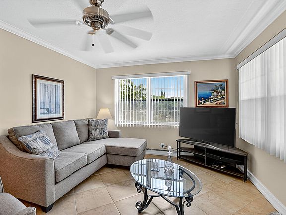 Welcome to this light and bright corner unit 1-bedroom, 1.5-bath second-floor condo, ideally situated in a quiet, desirable area. This beautifully renovated and fully furnished condo is truly move-in ready -- just bring your suitcase!Enjoy stylish updates throughout, including diagonal ceramic tile flooring, crown and upgraded base molding, and freshly painted interiors with elegant knockdown ceilings. The new appliances, central A/C, and hot water heater provide comfort and peace of mind. Every detail has been thoughtfully designed, from the remote-controlled ceiling fans to the tasteful furnishings.Relax with your morning coffee in the charming Florida room, or unwind at the BBQ picnic area overlooking the lake. Just a short walk to the pool, this home offers the perfect blend of tranquility and convenience. Association claims 55+ community.