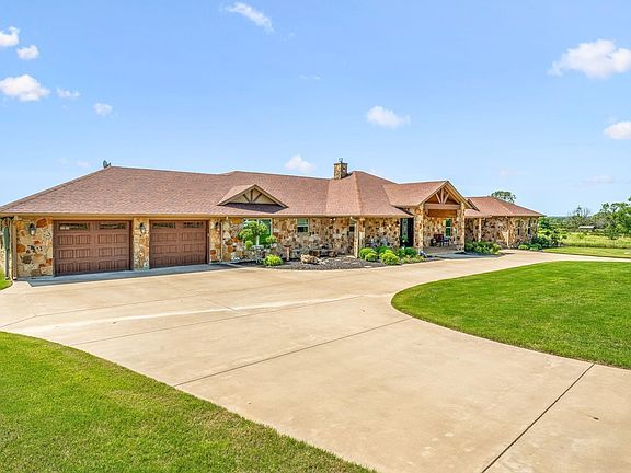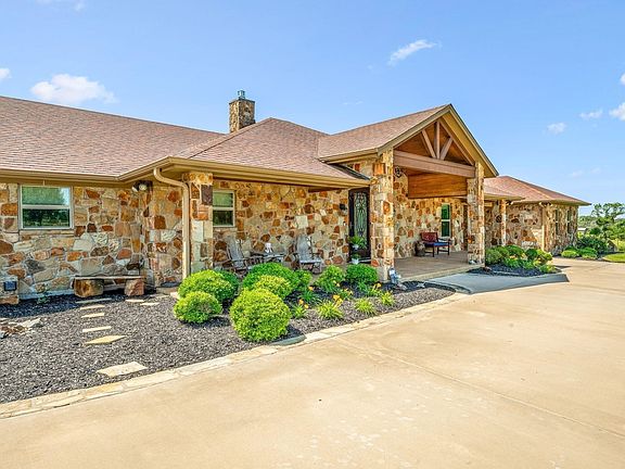 Magnificent Estate nestled on 5-acres in charming town of Granbury perfect for horses. 3714 sq ft Single-level Texas ranch-style home remodeled and expanded in 2017 by Will Steed. The property is completely fenced and the manicured grounds and irrigation system enhances the serene country living. The home features a large semicircular driveway and a lodge style front entry with natural stone masonry, timber accents, and a custom iron and glass door. The interior features hardwood and tile floors in the common areas, carpet in the bedrooms, and high-end quartz, granite, and onyx countertops throughout. The chef’s kitchen includes a Wolf professional-grade 4 burners with griddle gas range cooktop, 3 burner Wolf induction cooktop, dual convection wall ovens, warming drawer, built in side by side refrigerator-freezer, blanco sink and custom cabinetry. Adjacent to the kitchen, pantry includes wine storage for up to 350 bottles, and the dining area overlooks the patio, pool, and screened-in porch. The expansive living room features a gas fireplace, hand-crafted wooden beams, and a built-in surround sound system. Sliding glass doors provide access to the 2,133-square-foot pergola patio and saltwater pool area. The master suite includes a walk-in closet, mirrored vanity area, and an exceptional spa bath, including a large double vanity, oversized his-and-her shower, and a separate lavatory room. house features two secondary bedrooms with full baths, a craft studio or could be a 2nd living or play room, oversized laundry room. The West Wing offers a home office, exercise room, a temperature-controlled storage room and a full bath, with potential for conversion into a free-standing apartment. Additional features include a single-stall horse barn, a potting shed, storage building, foam insulation, a tankless hot water system, an advanced well water filtration system and security cameras with remote monitoring. This is truly a very special property and a rare find!