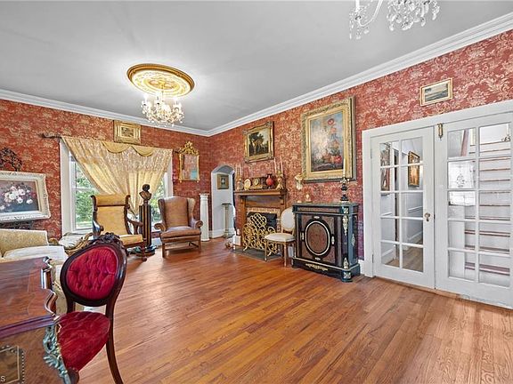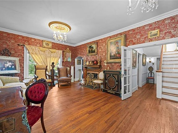 Elegant modern porcelain countertopsTall ceilingsGilded era wall paperWood floorsGrand marble walkwayCorner lotSpacious wood deck